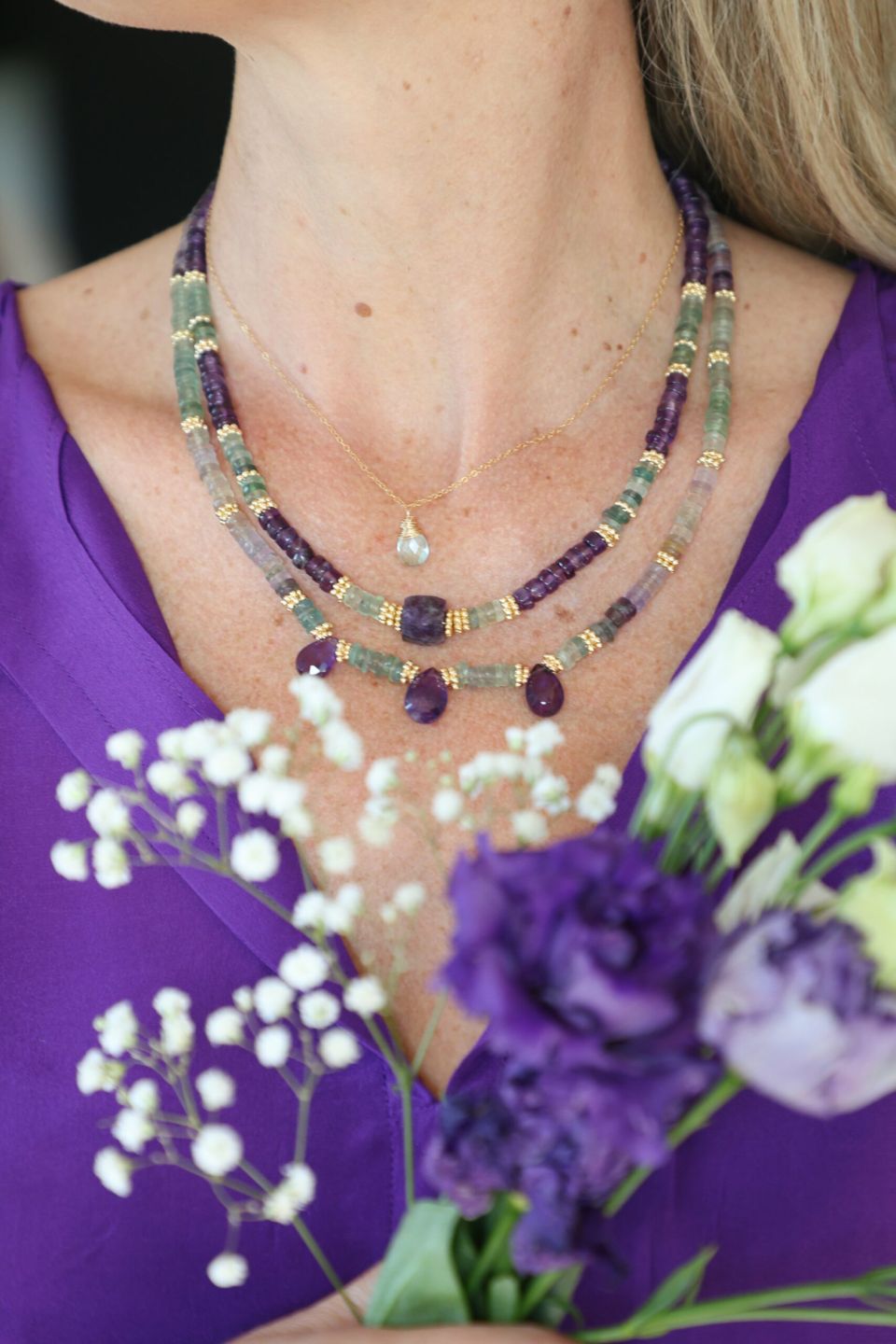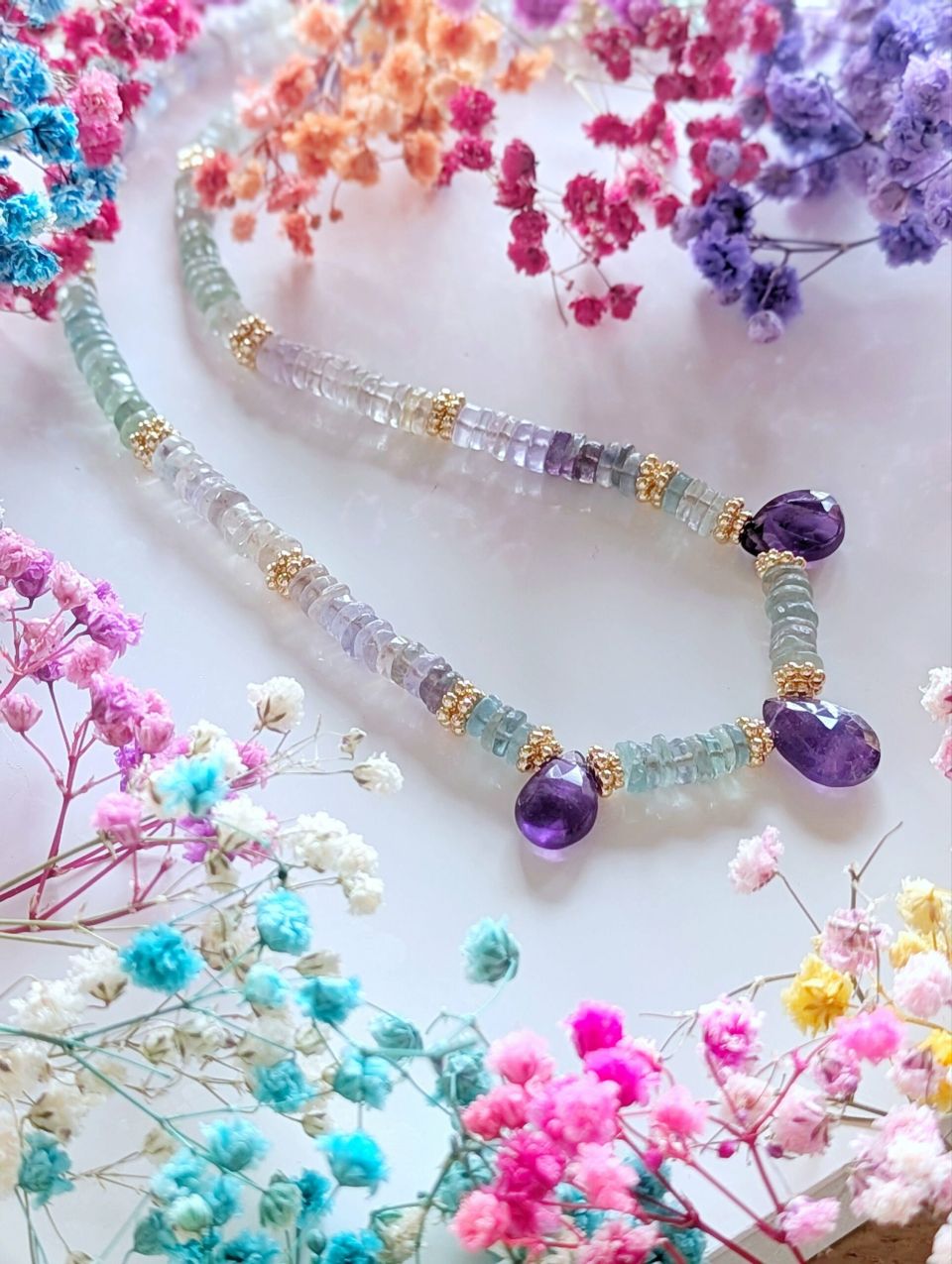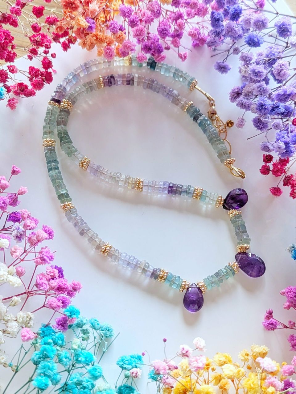 Ce collier original et lumineux en pierres fines heishi est un modèle UNIQUE. Il est entièrement composé de Fluorites et de 3 gouttes en Améthystes.Montage & matériaux